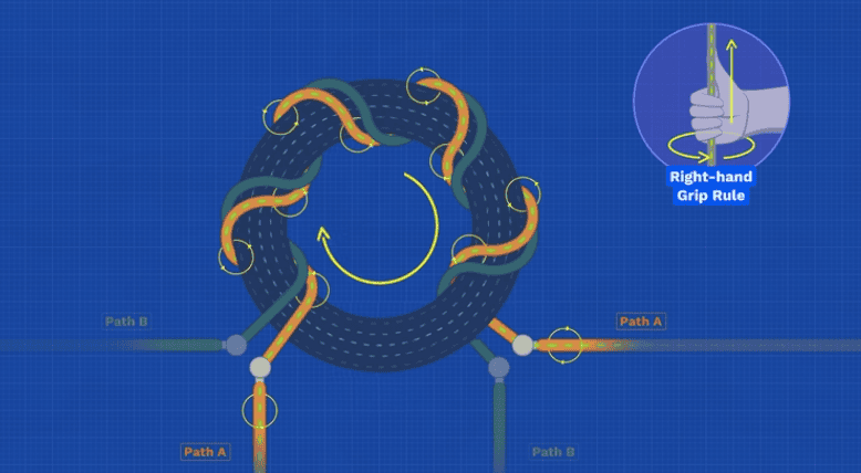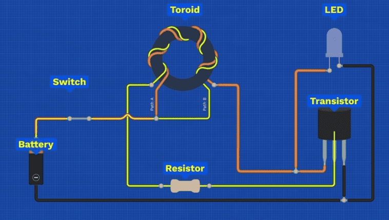 Path B, runs through a different wire in the toroid, this is in the opposite direction, then it passes through a resistor and then it reaches another terminal on the transistor.