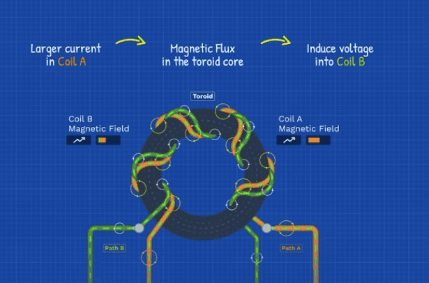 Now, If we add a second coil to the toroid core, the magnetic field generated by the first coil will flow through the second coil.