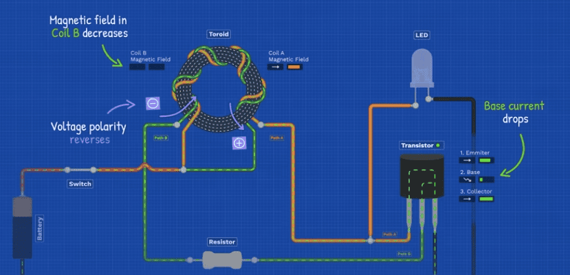 At the same time, the decreasing magnetic field causes coil B’s polarity to reverse, sending a negative voltage to the base pin. This will cause the transistor to instantly turn off and cuts off path A.