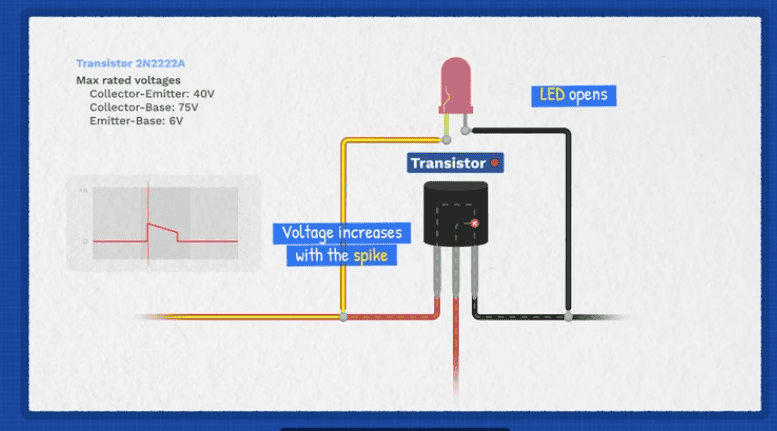 So the voltage increases with the spike until it reaches the LED’s threshold voltage, where the LED will open to allow current to pass through like an escape route, and as this happens it generates a burst of light.