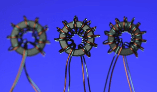 Notice the toroid consists of two separate wires coiled around a ring made from a ferrite material. That just means electricity can’t flow through it, but a magnetic fields can.